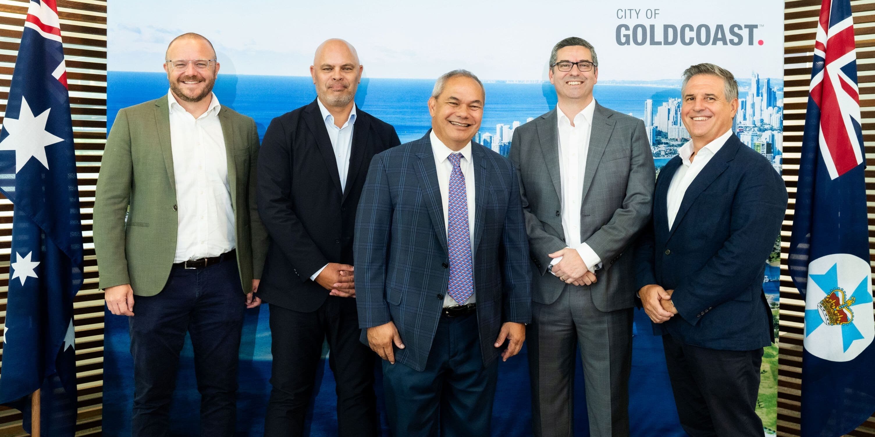 CAPTION BELOW: (Left to right) Christian Adamson, General Manager, Queensland, Built, Guy Ngata, Senior Vice President – Venue Development, Live Nation Australia & New Zealand, Gold Coast Mayor Tom Tate, Sergio Calcarao, Group Head of Development, Plenary, and Mark Girard, Chief Executive Officer, Invest Gold Coast.