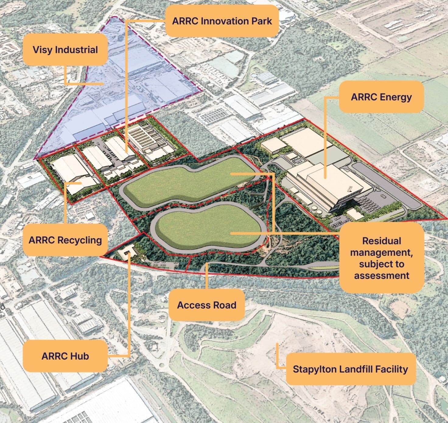 ARRC is a long-term, integrated precinct designed to transform how waste is managed across the city and region. It will support a shift away from reliance on landfill, increase local recycling and organics processing capacity, while creating new opportunities for innovation, jobs and industry growth within the circular economy. The precinct is being delivered in stages to address the city’s key streams of waste – starting with organics (green bin), followed by improved recycling (yellow bin) and planning for future energy recovery to manage non-recyclable or “residual” waste (red bin) in a way that aligns with environmental and community expectations.